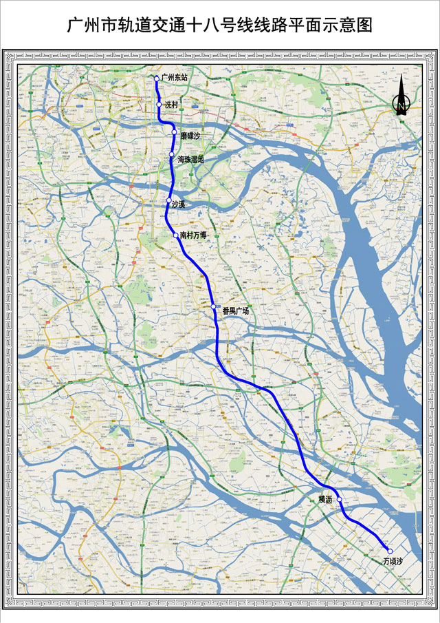 18号线全长61.3公里,从广州东站至万顷沙,均为地下线,共设站9座,其中换乘站8座。线路设万顷沙车辆段1座,陇枕停车场1座。车辆运行设计时速160公里/小时。目前,9座车站中,8座已封顶并进行车站装修及机电安装施工,1座(广州东站)进行前期准备。8个区间中,4个已贯通,4个进行土建施工。万顷沙车辆段、陇枕停车场正在进行机电安装施工。