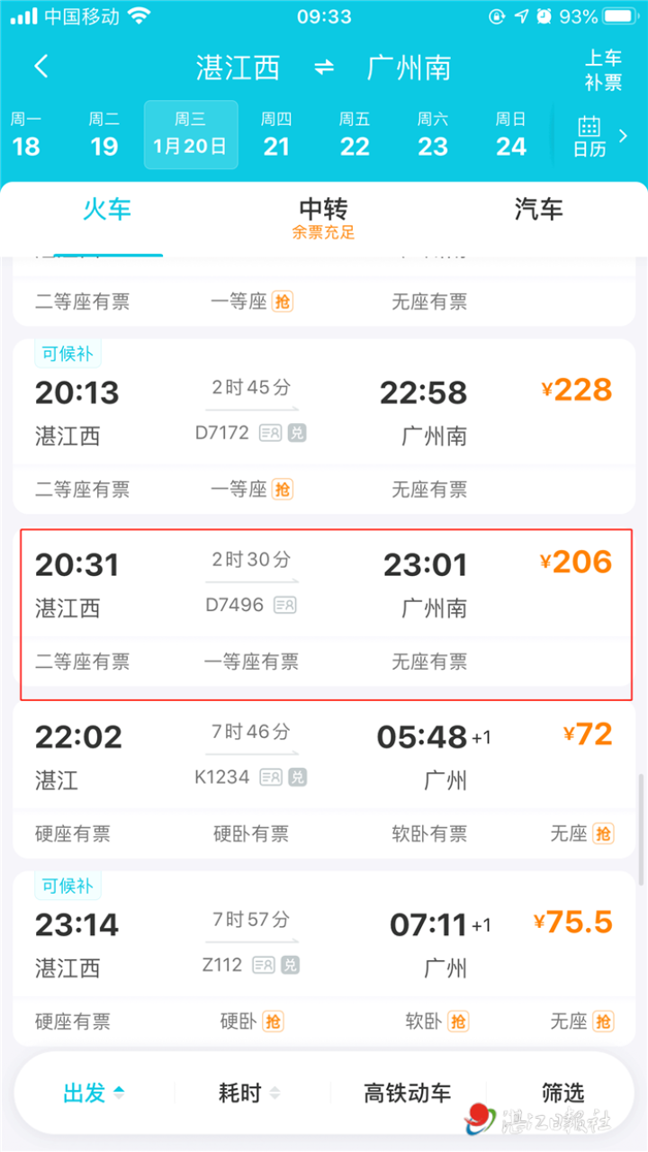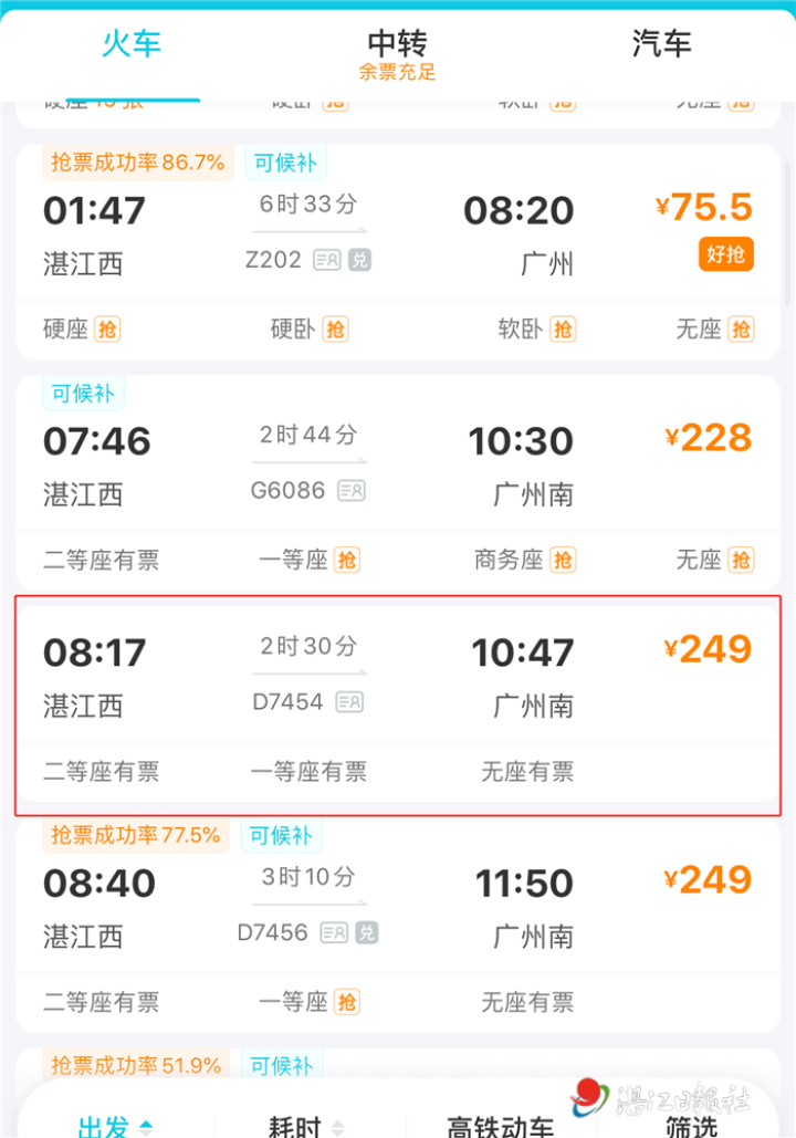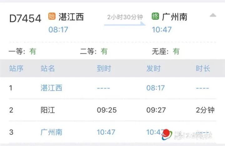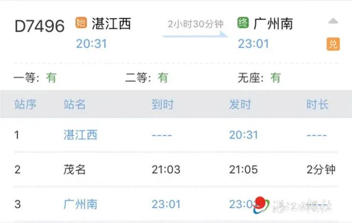 湛江西—广州南D7500次列车出发时间调整为8:00开,增加电白、小榄停站;
