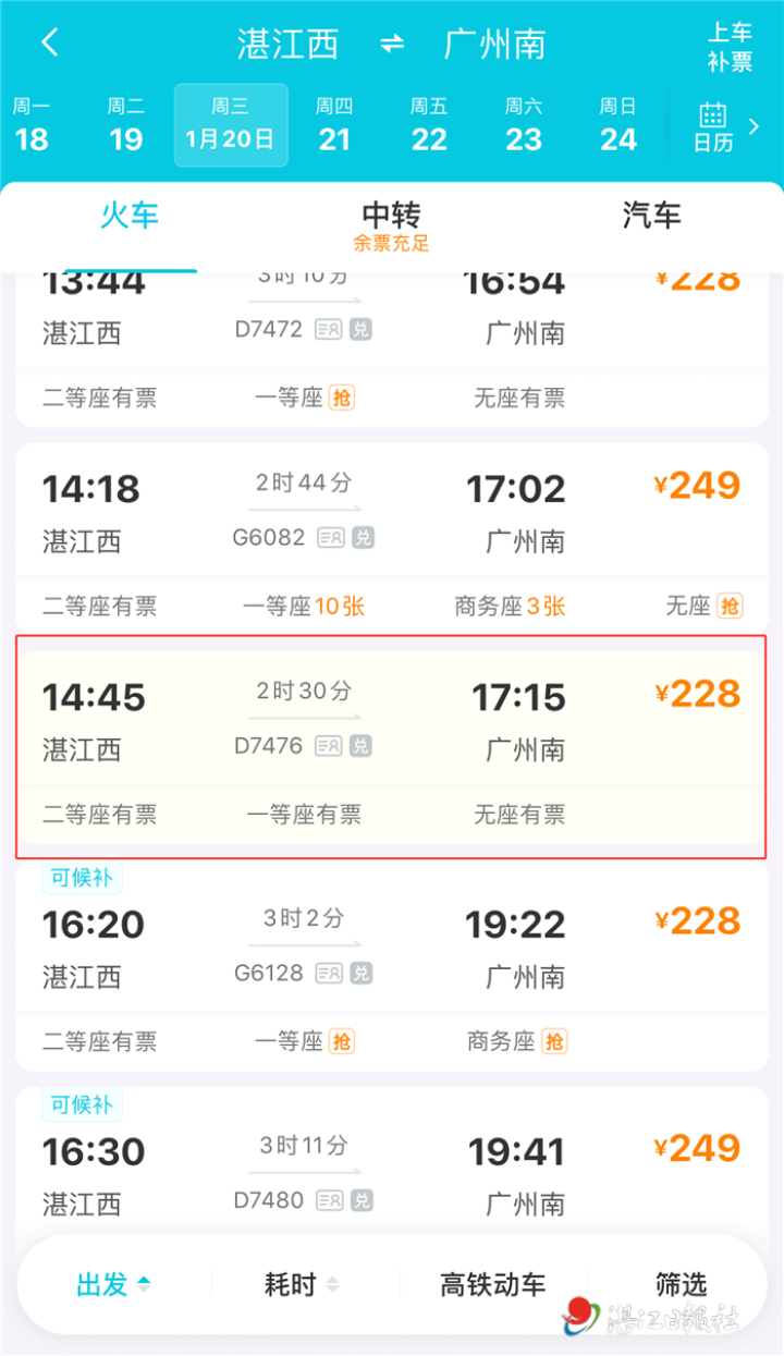 湛江西—广州南D7472次列车出发时间调整为13:44开;