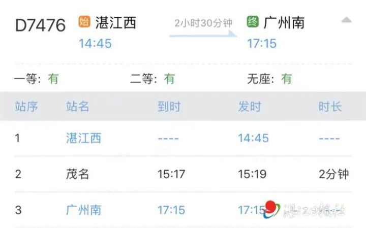 湛江西—广州南D7476次列车出发时间调整为14:45开,取消吴川、电白、阳西、阳江、恩平、江门停站;