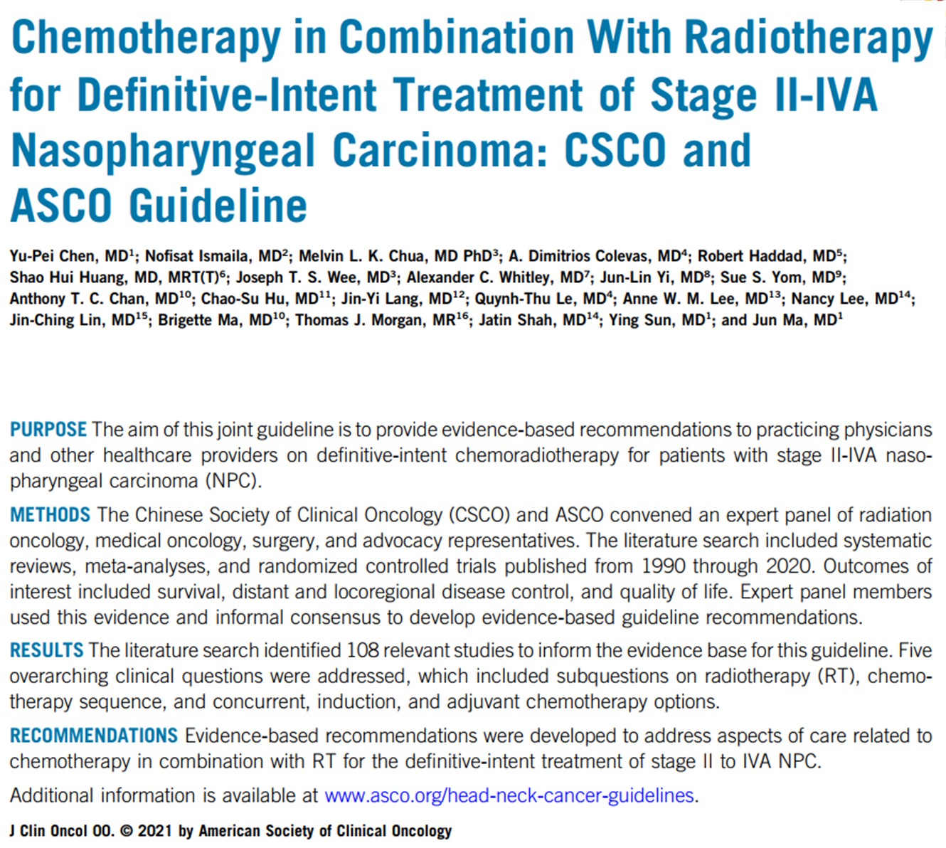 中山大学肿瘤防治中心马骏教授、孙颖教授为CSCO-ASCO鼻咽癌联合指南专家组的共同主席及该研究的通讯作者。通过领衔完成这项国际指南,在保证了我国患者受益的同时,也指导了国际鼻咽癌临床实践的规范化,确保了全球患者的最佳获益,充分展现了中国学者的世界担当。