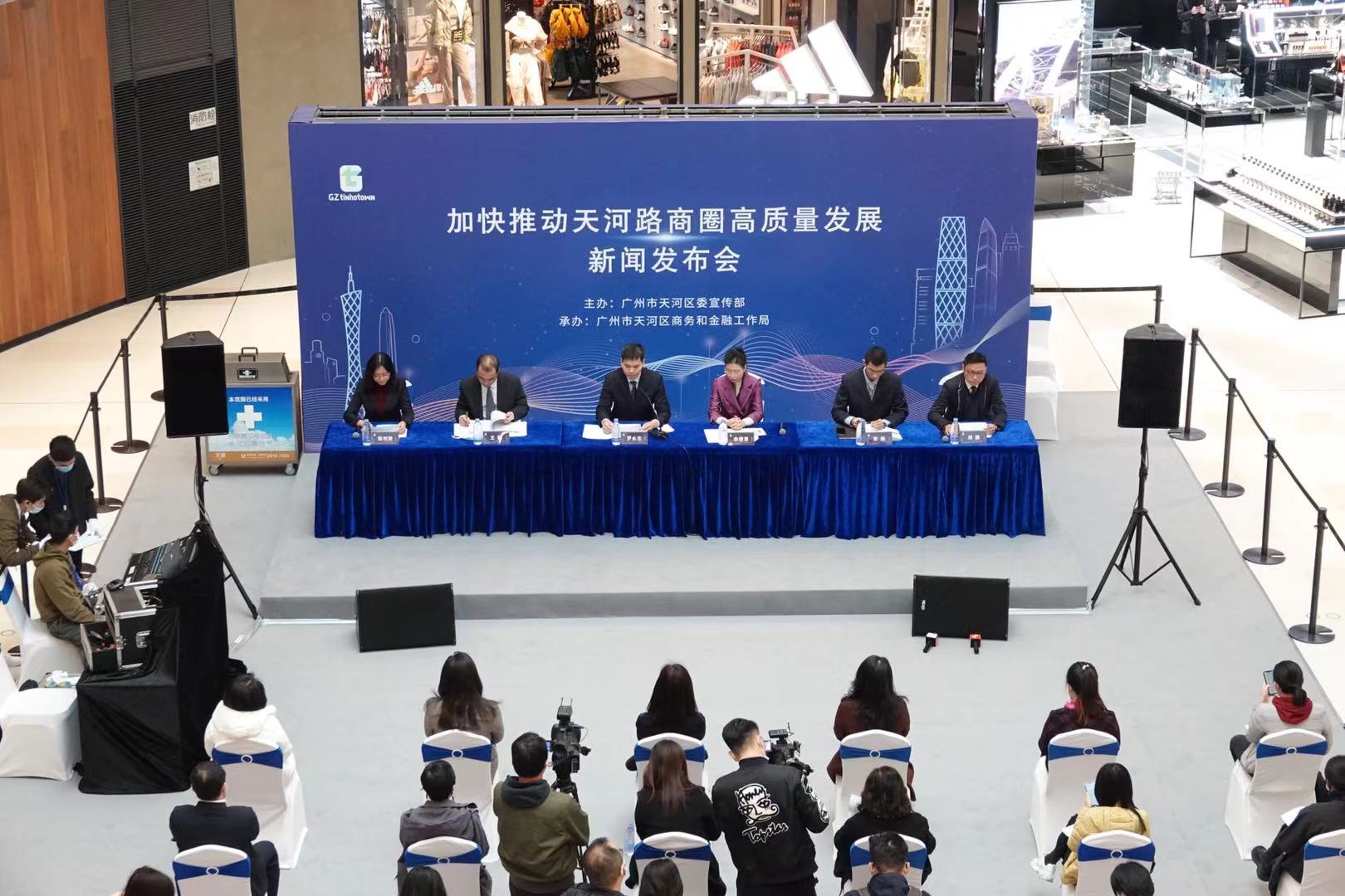 在新闻发布会上,天河区副区长罗永忠介绍《关于推动天河路商圈高质量发展的工作方案》(以下简称“工作方案”)出台背景及主要内容。天河路商会执行会长余绩慧介绍商会如何发挥作用,积极推动天河路商圈高质量发展。天河区发展改革局、商务金融局和住建园林局领导分别就产业政策、疫情防控、业态提升以及基础设施建设等方面回答了记者提问。