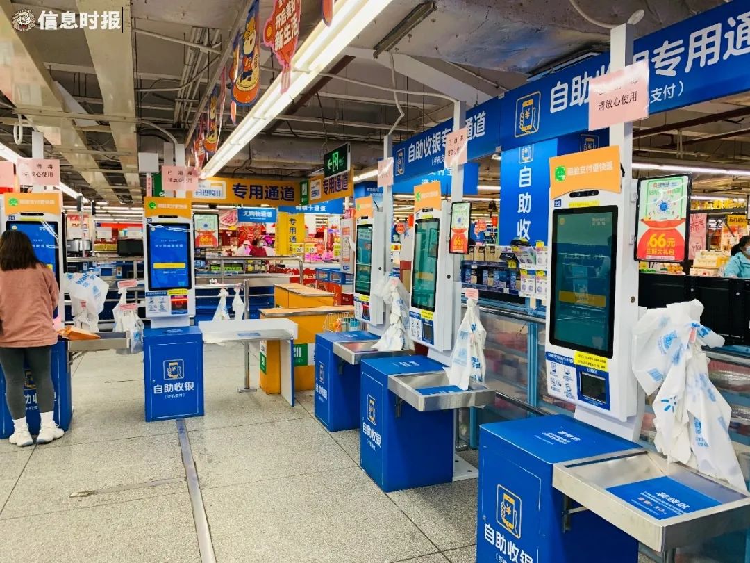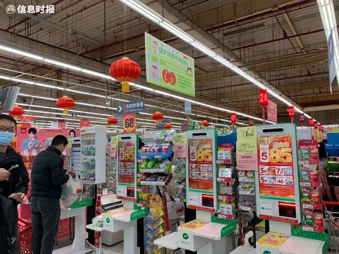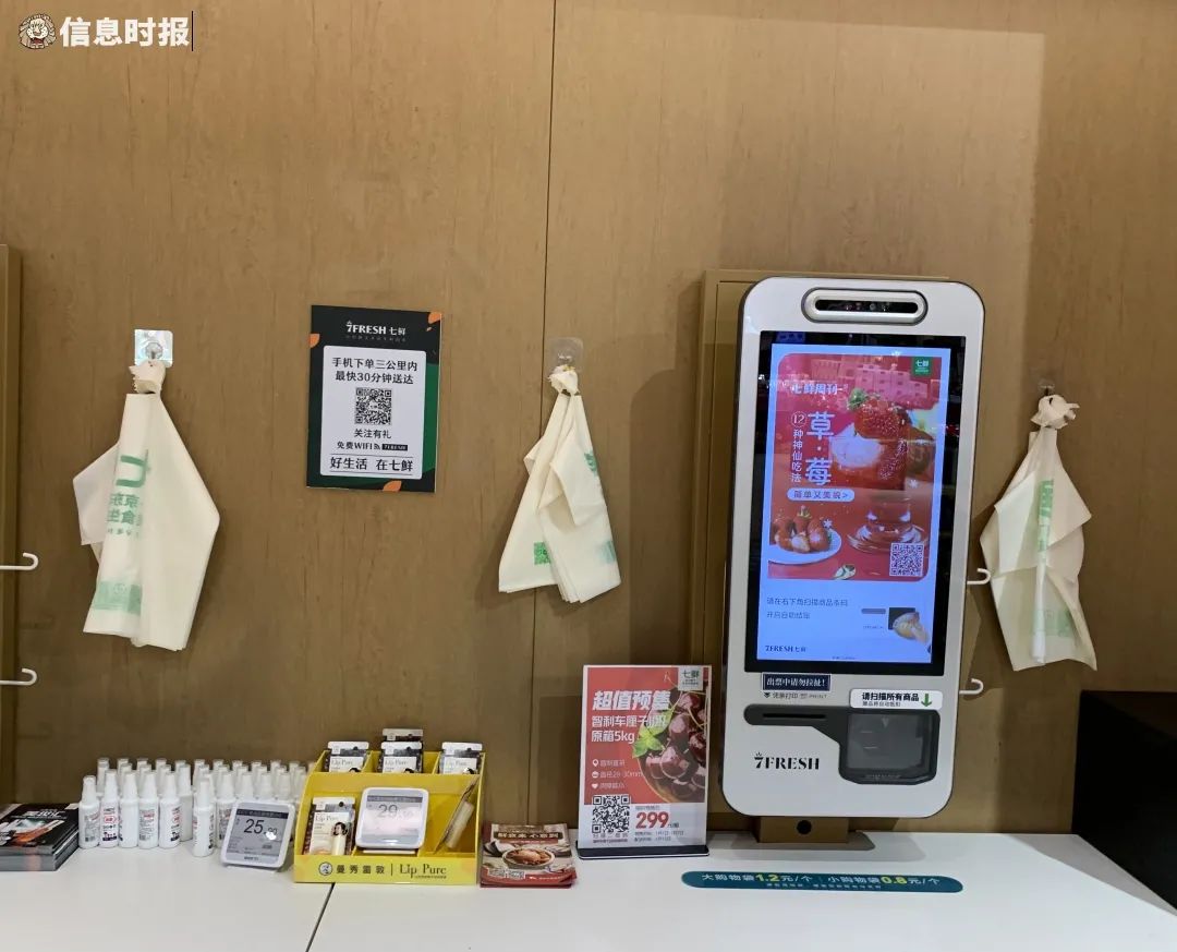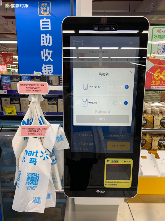 可降解购物袋小号价格为0.8元/个、可降解购物袋大号价格为1.2元/个。在自助收银台区域,该店还提供有特制的纸质礼品袋,价格为5元/个。