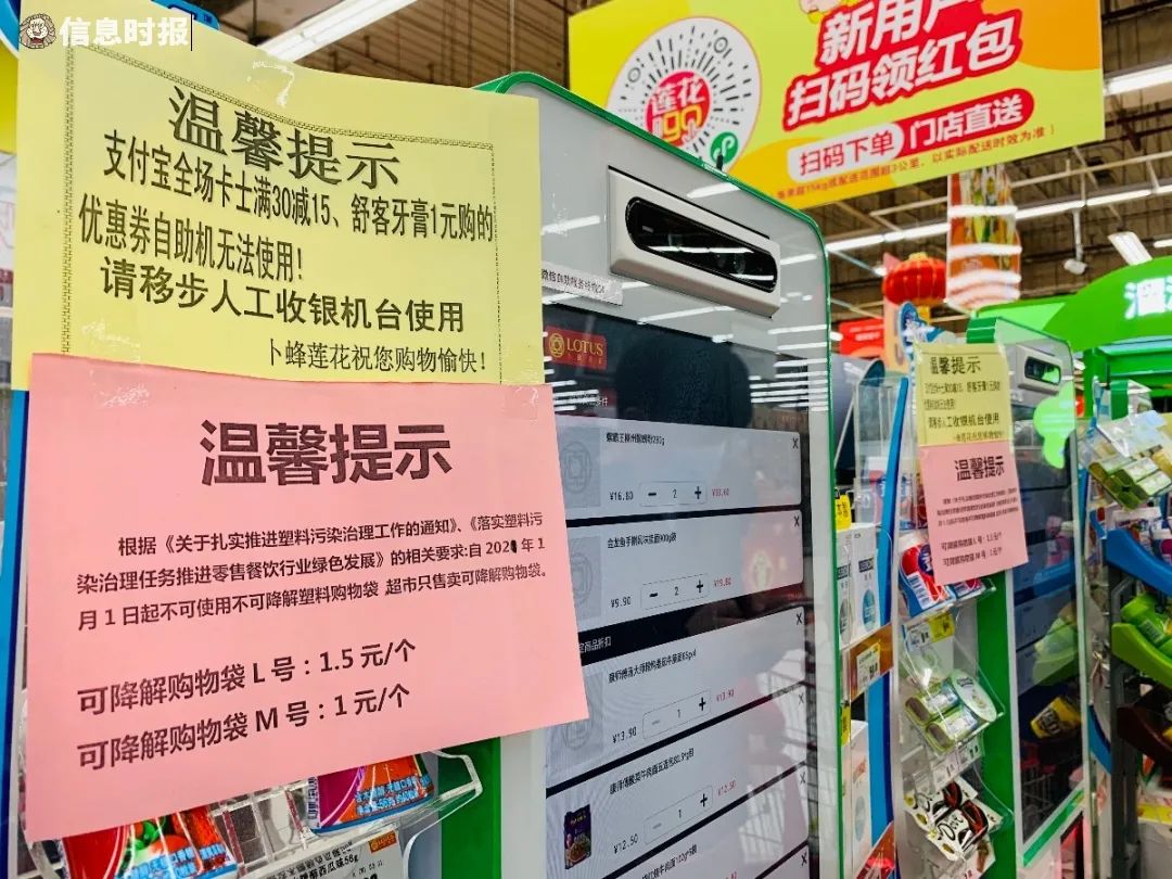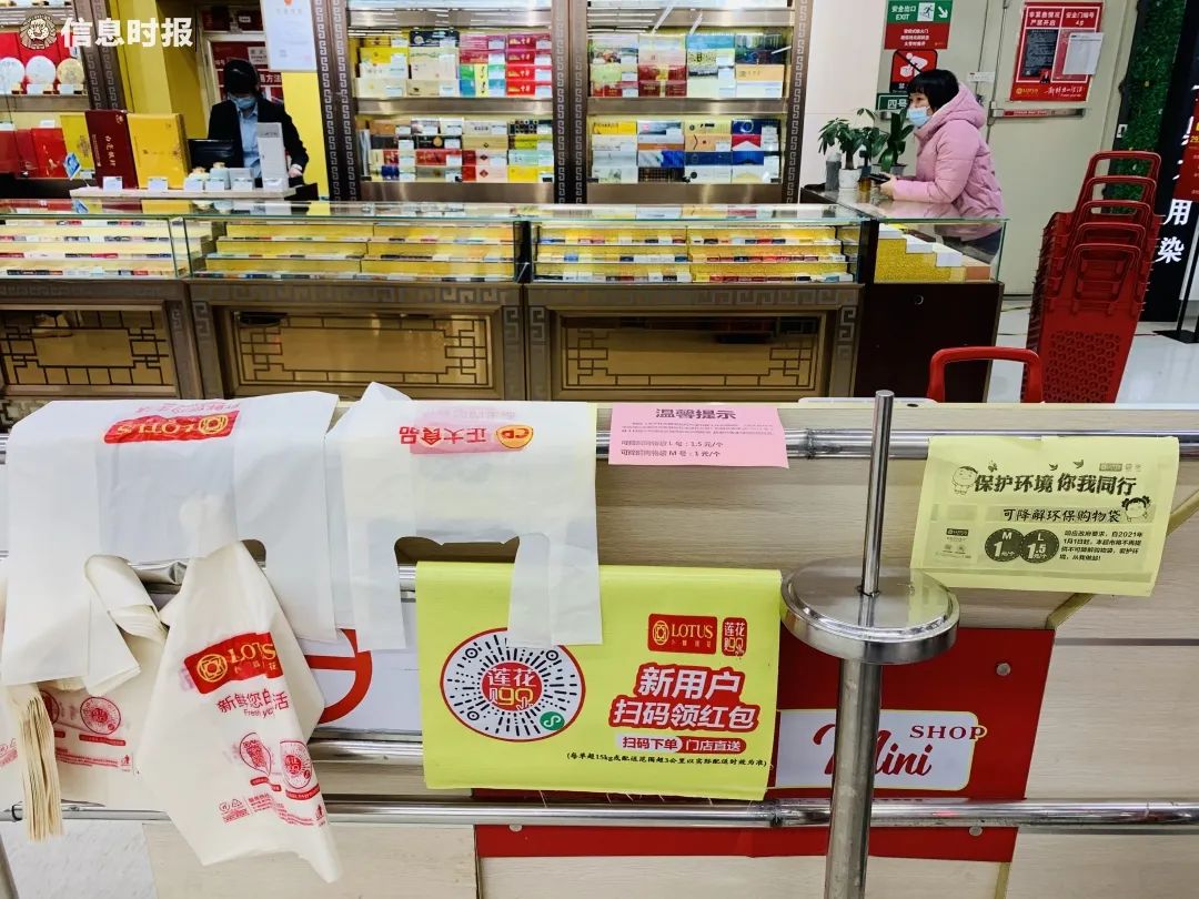 佳惠超市收银员则告诉记者,该超市一直使用的是定制款塑料袋,且并不售卖。“我们这里的塑料袋不卖的。来超市买东西,找我要袋子,那可以给你。”收银员介绍说。未来是否会改用可降解塑料购物袋?她表示,并不了解“禁塑令”的通知,因此也不确定未来是否会改用。