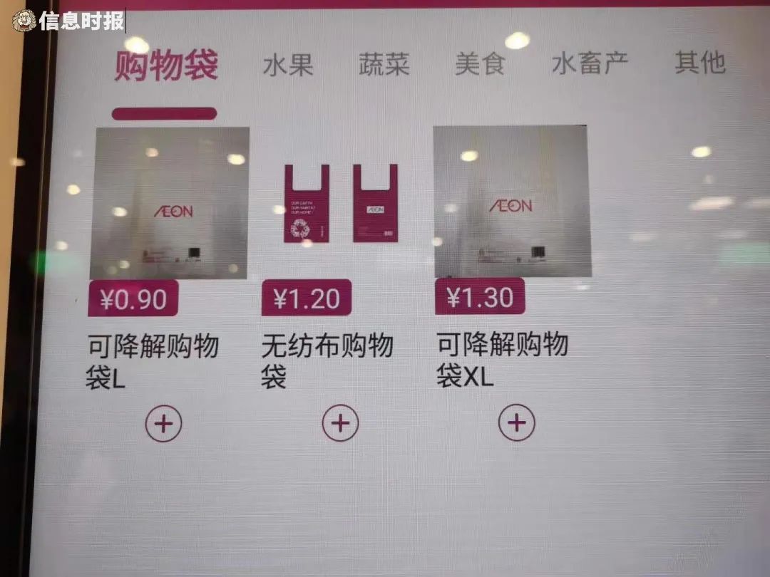 L号可降解塑料购物袋的单价为0.9元XL号可降解塑料购物袋的单价为1.3元。此外,永旺还提供可重复使用的无纺布购物袋,其价格为1.2元/个。