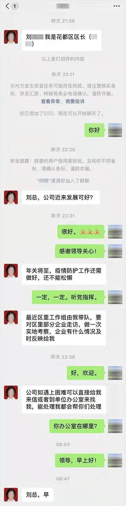 2020年12月末,番禺某行业协会的会长李某(化名)发现微信内有人发起好友申请,定神一看对方的头像及昵称竟然是区政府的领导,李某赶紧通过了验证,“领导”先是跟李某寒暄一番,话语中看得出“领导”对李某有一定了解,很难想到是别人冒充的。