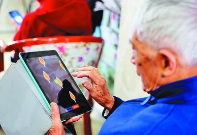 上海静安区江宁路街道爱老家园,在专为轻中度认知障碍老人开设的康复课上,一位老人通过玩小游戏进行认知训练。新华社发