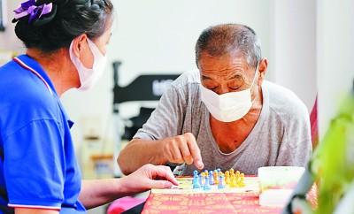 北京丰台区康助护养院宛平城养老服务驿站,一位老人与工作人员在玩跳棋。新华社发