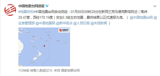 中国地震台网自动测定:01月08日08时28分在新西兰克马德克群岛附近(南纬29.47度,西经178.19度)发生6.3级左右地震,最终结果以正式速报为准。