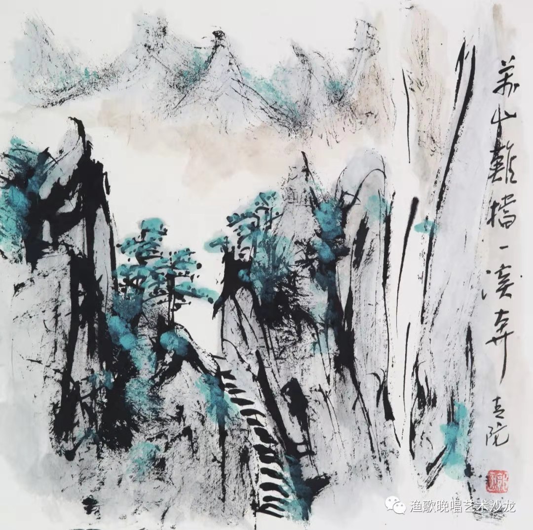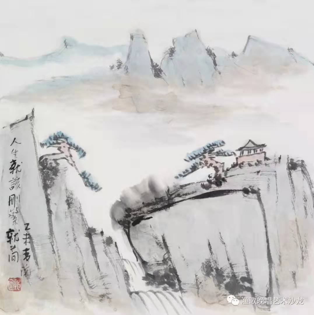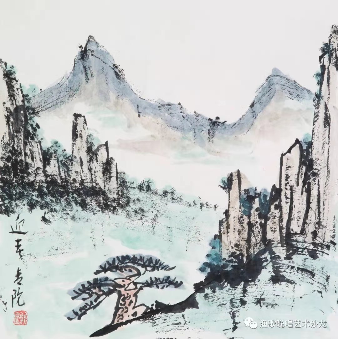 郭因先生作画经常是片纸数幅,秃笔几支,信手勾勒皴染,以小见大,平中显奇。他特别擅长简笔山水,寥寥数笔,苍劲,老辣,高洁,韵味无穷。所谓“简”,就是艺术的高度概括,高度锤炼,将现实中的形象,加以改变融化,赋予它新的结构和秩序而获取新的含义。在艺术创作中,“删繁就简”是很难的。郭因先生对中国绘画几千年的历史烂熟于心,谈及历代画家的风格如数家珍,对绘画理论的发展脉络更是“胸中有一本清账”,深厚学识素养滋润,成为他艺术创作的极大助力。