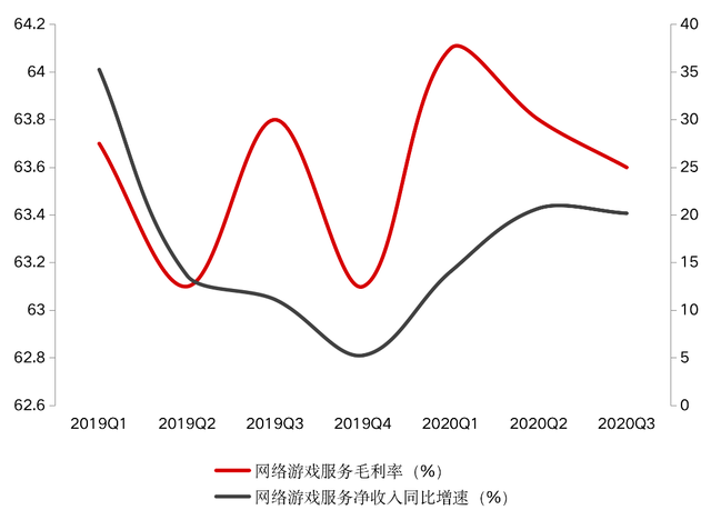 网易公司发布2020年第三季度财报显示,网易公司第三季度营收约187亿元,同比增长27.5%,净利润为30亿元;持续经营净利润36.7亿元。其中在线游戏服务收入138.6亿元,同比增长20.2%,网络游戏服务净收入占比高达74.3%。但对比2019年第一季度至2020年第三季度,该公司网络游戏服务净收入同比增速已由2019年第一季度单季的35.26%下降至今年第三季度单季的20.18%,且其网络游戏服务净收入同比增速曾于2019年第四季度降至个位数。此外需要注意的是,今年第三季度网易网络游戏服务毛利率为63.6%,而今年第一季度、第二季度其毛利率则分别为64.1%、63.8%。分季度来看,今年以来,该公司网络游戏服务毛利率整体处于下降通道。对此,该公司在财报中表示,“网络游戏服务的毛利率总体稳定,根据手机和PC游戏以及自主开发、许可的游戏的收入组合,在窄幅区间内波动”。