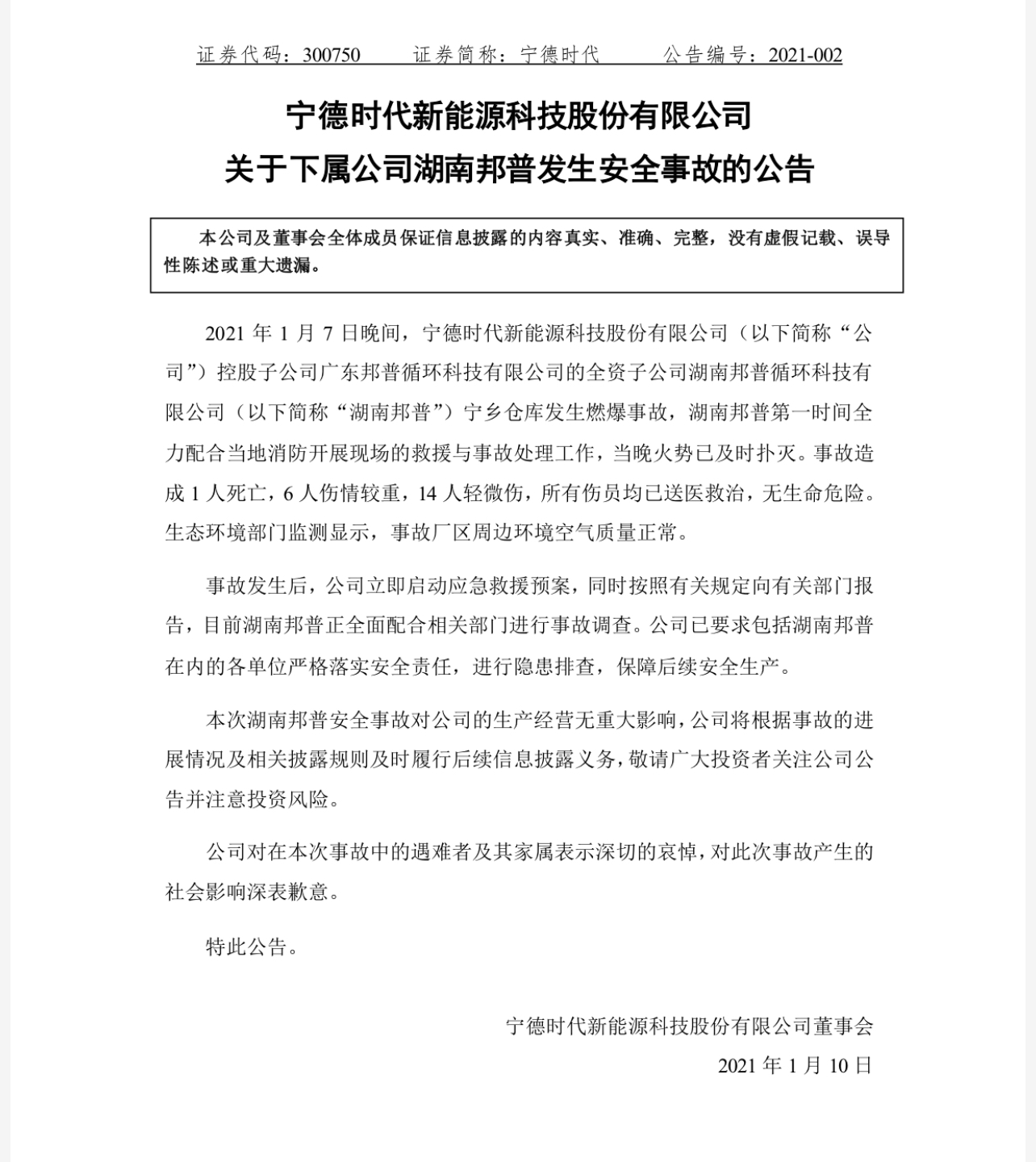 1月10日,宁德时代发布公告称,1月7日晚间,宁德时代新能源科技股份有限公司控股子公司广东邦普循环科技有限公司的全资子公司湖南邦普循环科技有限公司(以下简称“湖南邦普”)宁乡仓库发生燃爆事故,湖南邦普第一时间全力配合当地消防开展现场的救援与事故处理工作,当晚火势已及时扑灭。事故造成1人死亡,6人伤情较重,14人轻微伤,所有伤员均已送医救治,无生命危险。