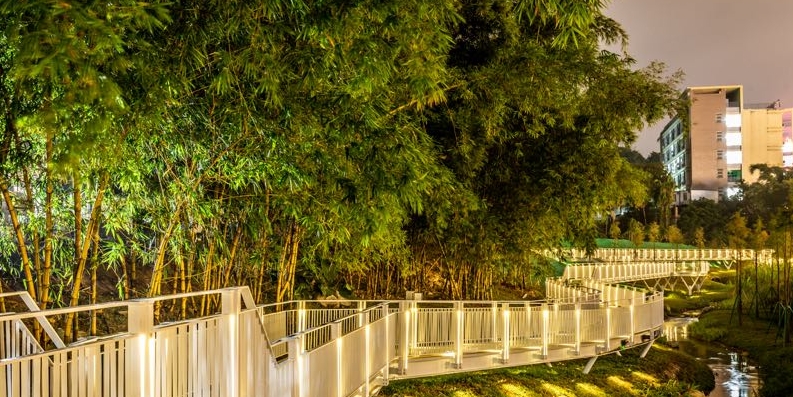 湿地旁的栈桥又是一处非常亮眼的景点。行走在栈道上,可细细感受令人心旷神怡的自然景观。栈道两边的太阳能灯在不同的区域提供强度适中的灯光,即便是在夜间,广大市民也可安心在此处散步。
