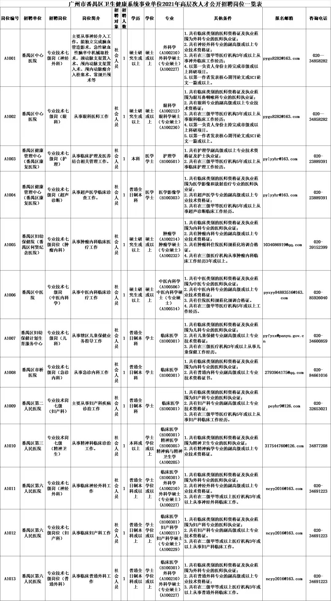 各招聘单位咨询联系电话见《广州市番禺区卫生健康系统事业单位2021年公开招聘高层次人才岗位一览表》。