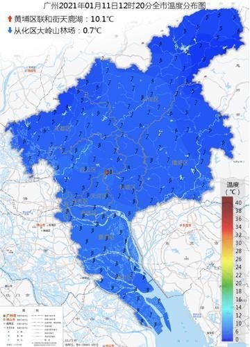 截至1月11日12时20分,广州各自动气象站记录到的实时气温反映天气仍然寒冷,中心城区普遍报出7℃到8℃的气温,黄埔区联和街天鹿湖自动气象站报出10.1℃的瞬时全市最高温;北部的从化比中心城区气温要低,其中全市最冷的从化大岭山自动气象站报出0.7℃。