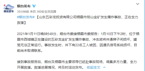 记者从烟台市人民政府新闻办公室获悉,2021年1月11日晚8时48分,山东烟台市委接栖霞市委报告,1月10日下午2时,位于栖霞市西城镇正在建设的五彩龙金矿发生爆炸事故,冲击波将井通梯子间损坏,罐笼无法正常运行。事故发生时,井下有22名工人被困,因通讯信号系统损坏,目前尚未取得联系。