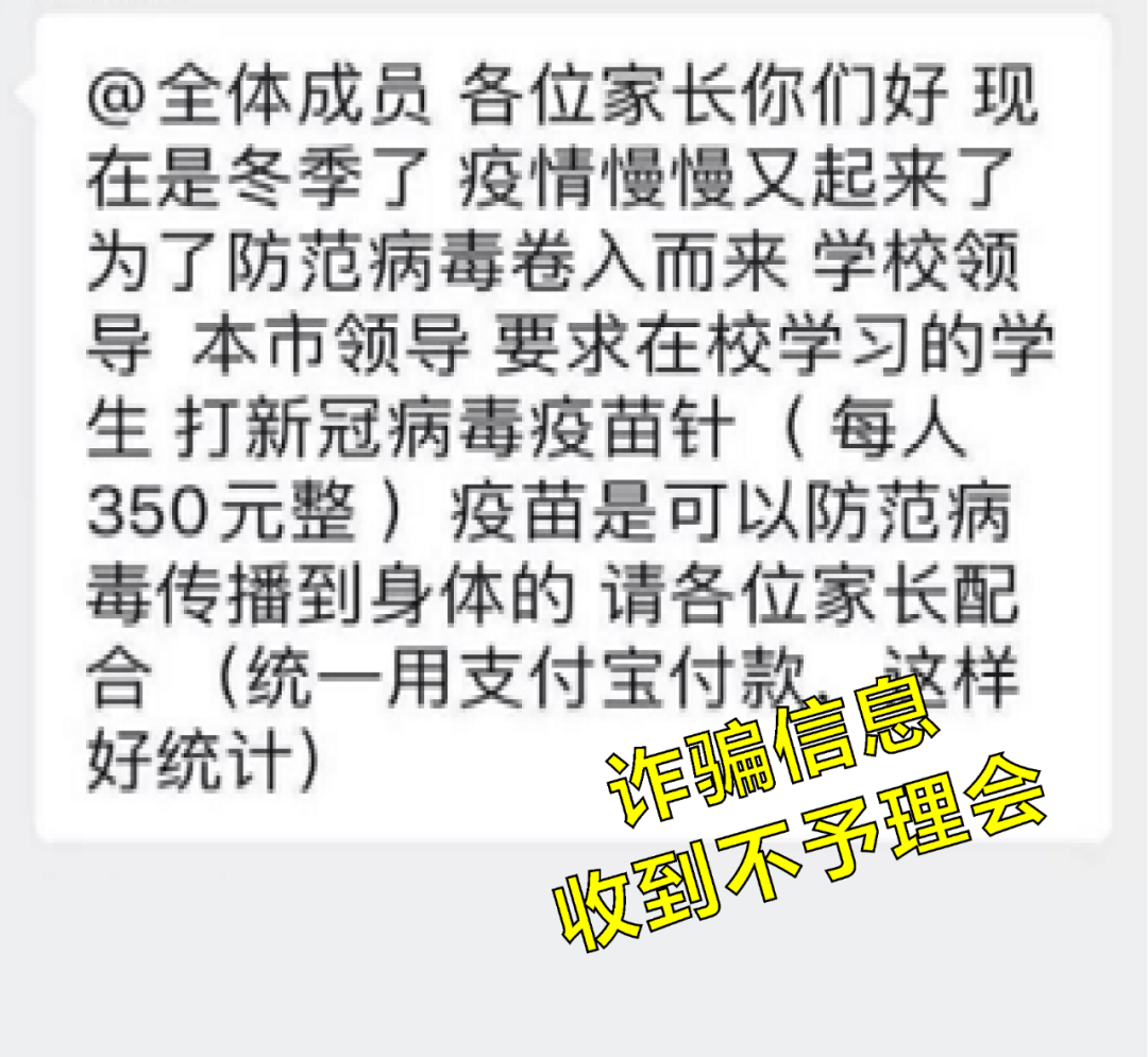 “老师、亲友、同事、领导”等熟人在社交群收到的交费打疫苗信息,在未核实对方身份前,切忌转账。