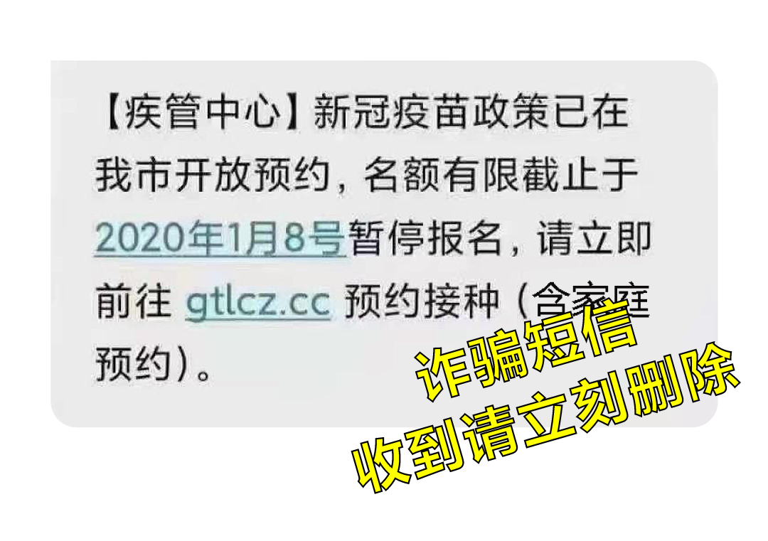 骗子冒充疾控中心散发“交费接种新冠疫苗”的短信,其中包含引诱性链接,也是就钓鱼网站,一旦点击,切勿输入个人信息、银行卡号、密码及手机验证码。
