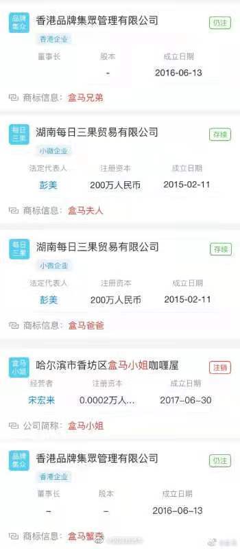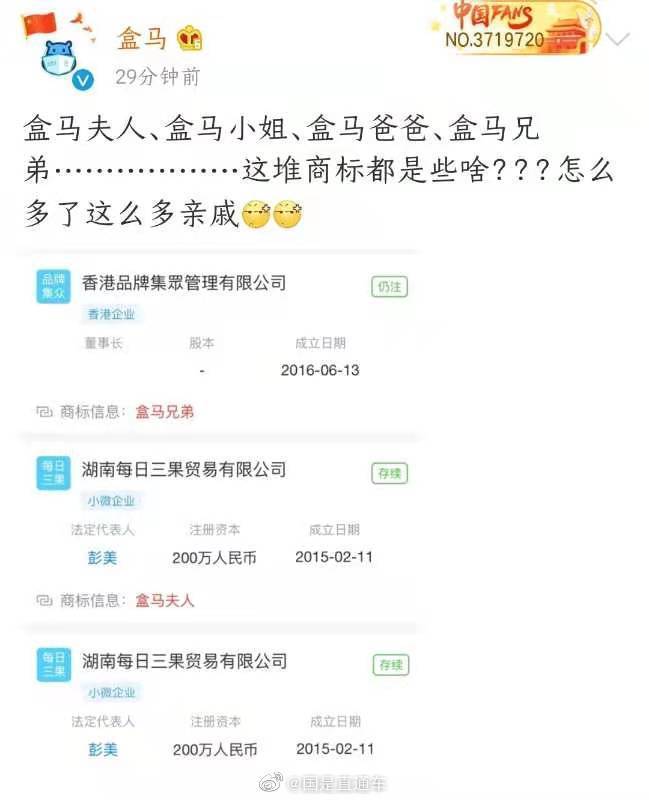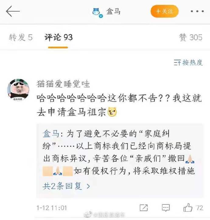 12日,盒马官博吐槽突然多了一堆亲戚,其中包含盒马夫人、盒马小姐、盒马爸爸等。在回复网友留言时,@盒马 表示: 以上商标已向商标局提出商标异议。如有侵权行为,将采取维权措施。