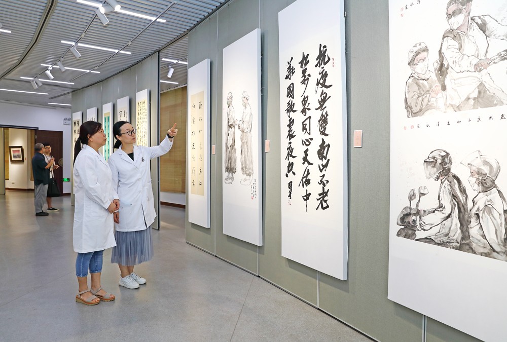 天河艺苑二楼小展厅有关抗疫的展览吸引了医务人员来参观。