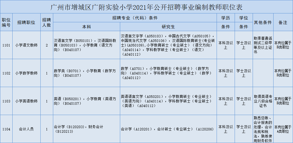 增城面向全国公开招聘广州市增城区广附实验小学专任教师4人,会计人员1人。考点设在广大附中增城实验中学校区。