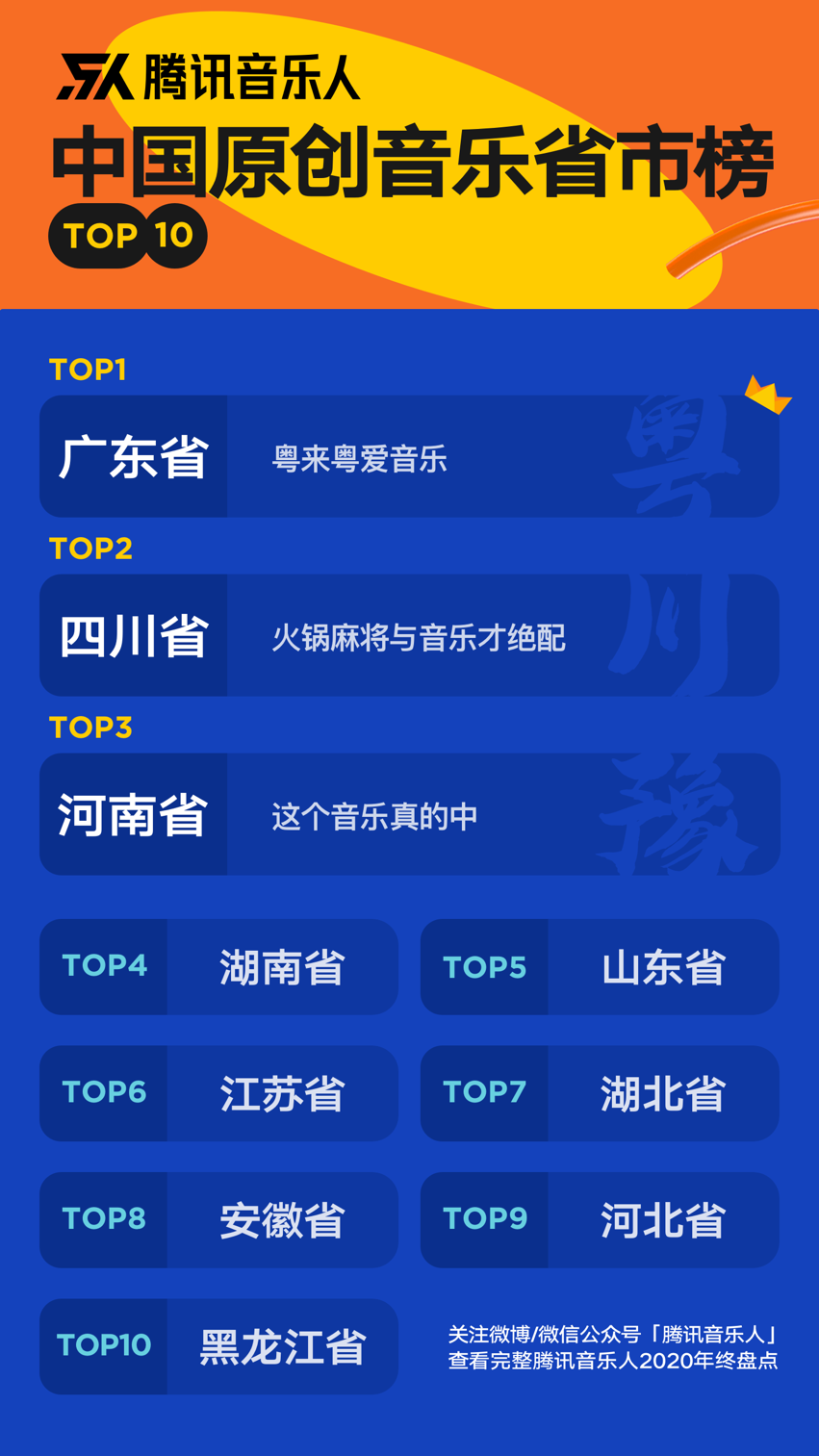 中国原创音乐城市榜TOP10出炉,广东、四川、河南位列前三