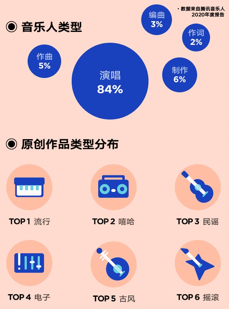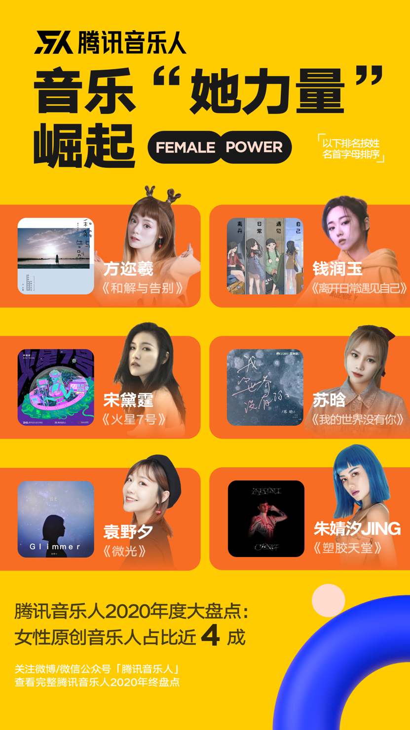 在音乐行业里,女性音乐人一直占少数。在2019年中国传媒大学发布的《2019中国音乐人生存状况报告》中,女性音乐人只占了18%;在2018年IFPI发布的《2018全球音乐报告》中,全球十大唱片艺人里仅有两名女性。但当前音乐人中的“她力量”正在迅速崛起。《2020年中国在线音乐行业报告》中,女性创作者占比从2018年22.7%上升至2020年30.8%。腾讯音乐人的年终盘点也显示,平台入驻的女性原创音乐人占比已达近4成。