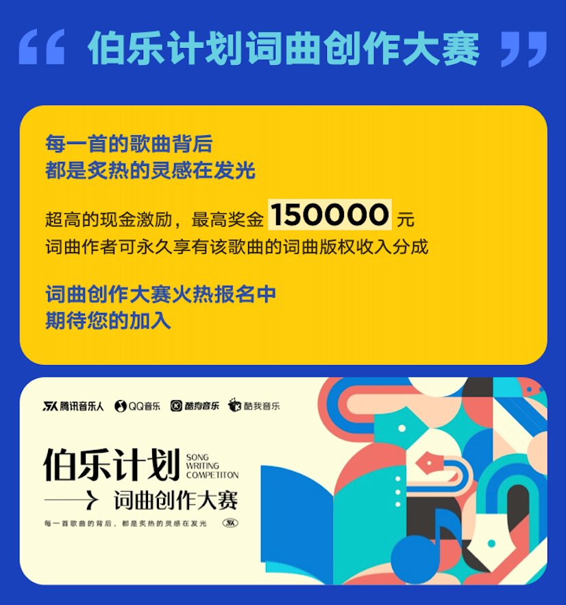 近期腾讯音乐人还上线了“伯乐计划”,通过向词曲创作者征集优秀的词曲作品,给予词曲创作者更多资源。在该计划下,不仅能为好词曲找到适合的声音,更能持续生产高质量高热度的音乐内容,进一步助力中国原创音乐行业蓬勃发展。“伯乐计划”已重磅邀请了十二位知名词曲创作人抢先入驻,包括著名音乐人陈克华、崔轼玄、高见、何厚华、梁文福、林煌坤、林秋离、瑞业、文雅、熊美玲、许常德、于光中等业内顶级前辈作为伯乐计划的先行者,以此吸引更多年轻新声代加入。