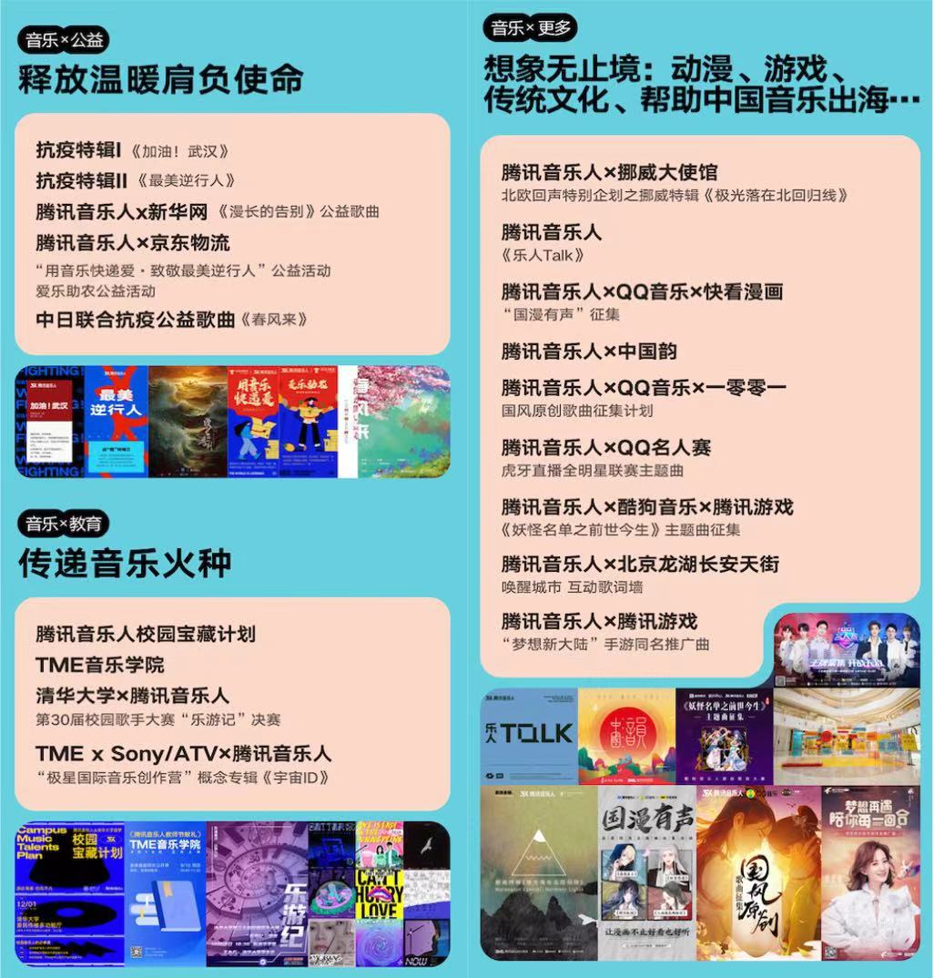 同时,作为原创音乐人的服务中台,腾讯音乐人不断拓展和布局原创音乐多元版图,2020年跨界多维领域热门IP,为音乐人提供更丰富的创作场景。在音乐结合公益领域,腾讯音乐人推出《加油!武汉》《漫长的告别》等公益歌曲征集、与品牌联动推出如“用音乐快递爱·致敬最美逆行人”等公益活动,用音乐传递公益。在音乐结合教育领域,腾讯音乐人正式启动了“腾讯音乐人校园宝藏计划”,推行TME音乐学院,为行业扶持培养更多年轻音乐人提供了学术依托。