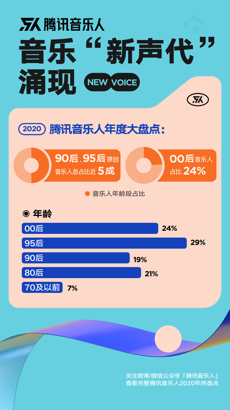 随着数字音乐平台成为了音乐人职业发展的核心阵地,各平台入驻的音乐人也日趋年轻化。据腾讯音乐人2020年度盘点数据显示,90后、95后及00后音乐人群体超7成,已成原创音乐创作主力军。值得注意的是,除了位居榜首占29%的95后,还在求学阶段的00后更是位列第二,占到了全平台音乐人的24%。