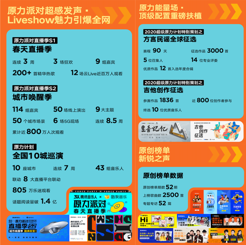 2020年,腾讯音乐人继续发力,从原力计划、月亮沙龙、原创榜单等核心板块入手,进一步优化和升级。春夏两季,为满足乐迷们足不出户就能畅快听音乐的需求,腾讯音乐人推出原力派对直播季S1春天直播季和S2城市唤醒季等线上音乐直播,并联动各大直播平台,吸引累计超千万人次观看。近期,腾讯音乐人的原力计划连续7周在10座城市巡演,线上线下打破次元壁,吸引上万乐迷亲临现场和超800万人次线上观看。