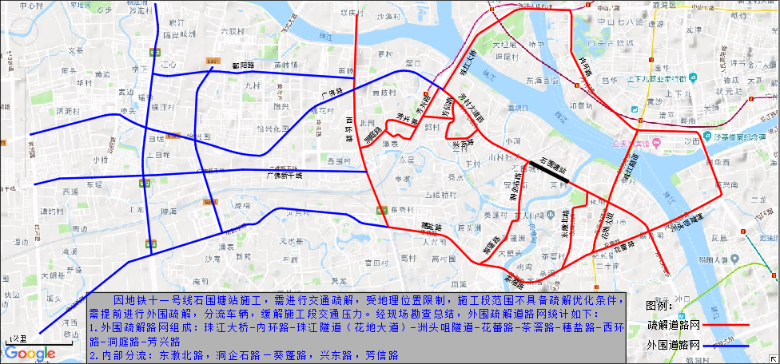 1.外围绕行线路:珠江大桥-内环路-珠江隧道(花地大道)-洲头咀隧道-花蕾路-茶滘路-穗盐路-西环路-洞庭路-芳兴路。