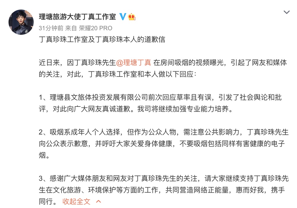 中新网成都1月13日电 (记者 刘忠俊)13日下午,丁真珍珠工作室通过其微博就一段@理塘丁真抽烟视频在网上流传引发关注和争议事件公开回应并公开道歉。