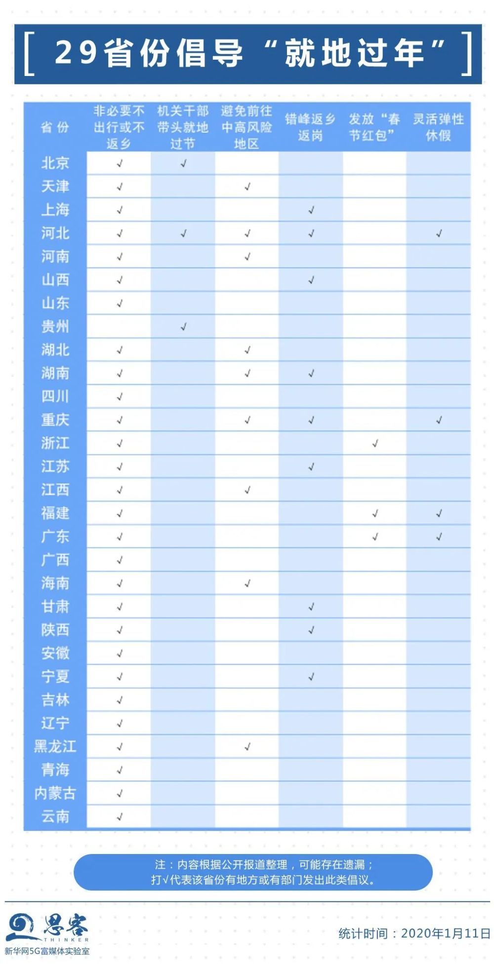 今冬明春疫情防控形势依然严峻复杂,截至1月11日15时,已有29个省份倡议就地过年。北京市在全国第一个提出了“就地过年”的倡议。天津、上海、重庆、河北等省份发出倡议,主要内容为外地务工人员“非必要不返乡”,本地居民“非必要不出省”“各企事业单位错峰离岗返乡、实行弹性休假制度”等。