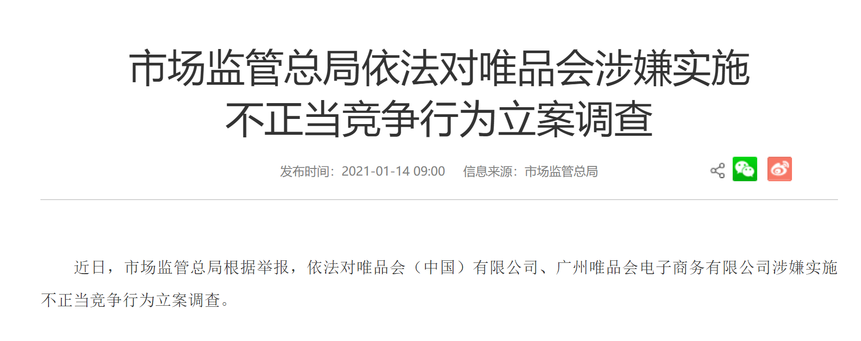 据市场监管总局官方网站今日(1月14日)发布的消息,根据举报市场监管总局依法对唯品会(中国)有限公司、广州唯品会电子商务有限公司涉嫌实施不正当竞争行为立案调查。对于此次立案调查,唯品会方面表示,已经接到通知,将积极配合监管部门调查。