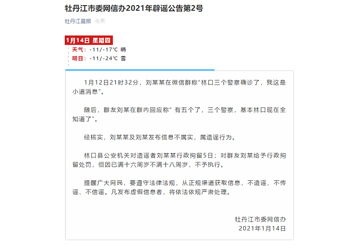 1月14日,牡丹江市委网信办发布辟谣消息:1月12日21时32分,刘某某在微信群称“林口三个警察确诊了,我这是小道消息”。