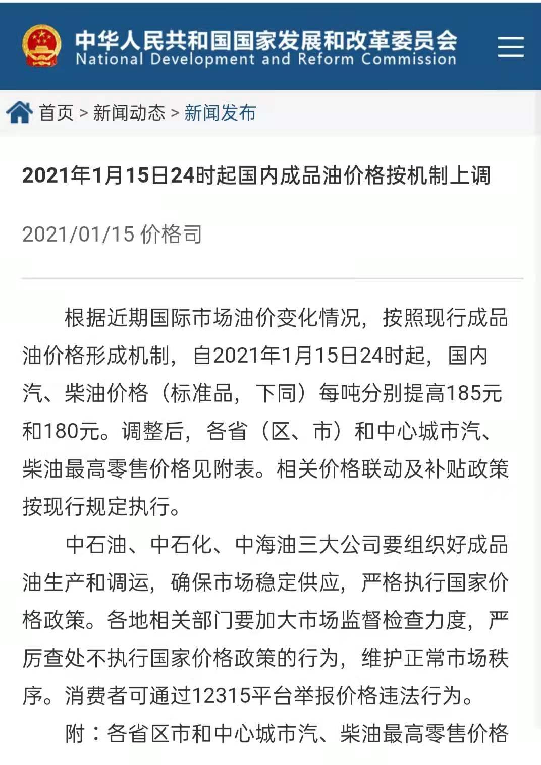 根据国家发改委官网最新消息,新一轮成品油调价窗口将于今天(1月15日)24时开启。
