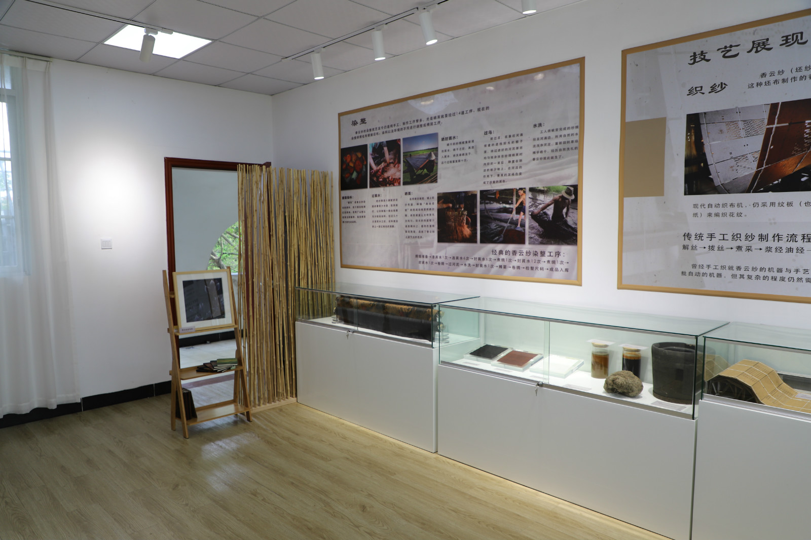 在冼星海文化艺术创作中心二楼,有非遗香云纱展示馆,展示香云纱技艺、传统手工织纱制作流程。