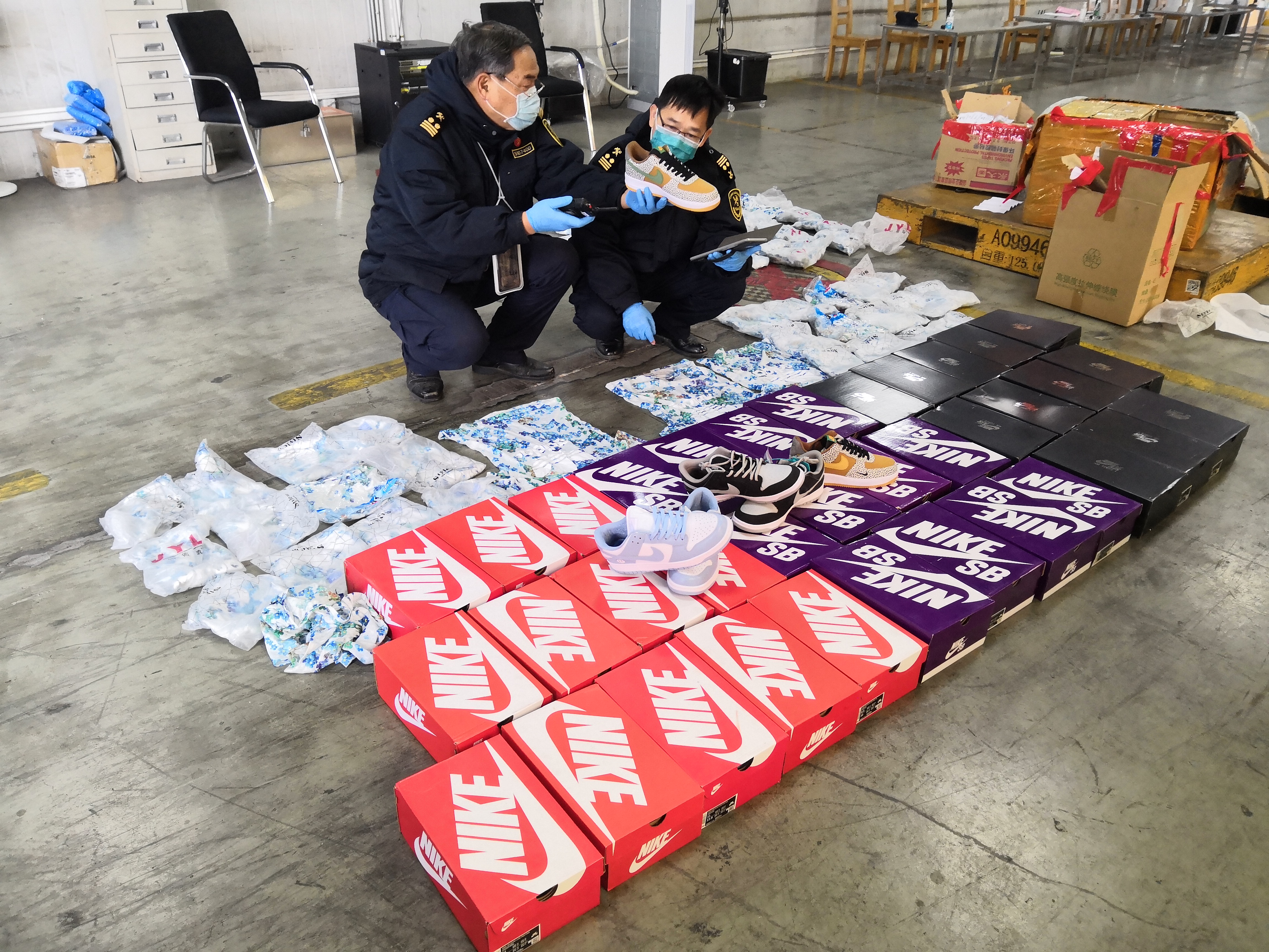 海关关员正在查验出口侵权货物