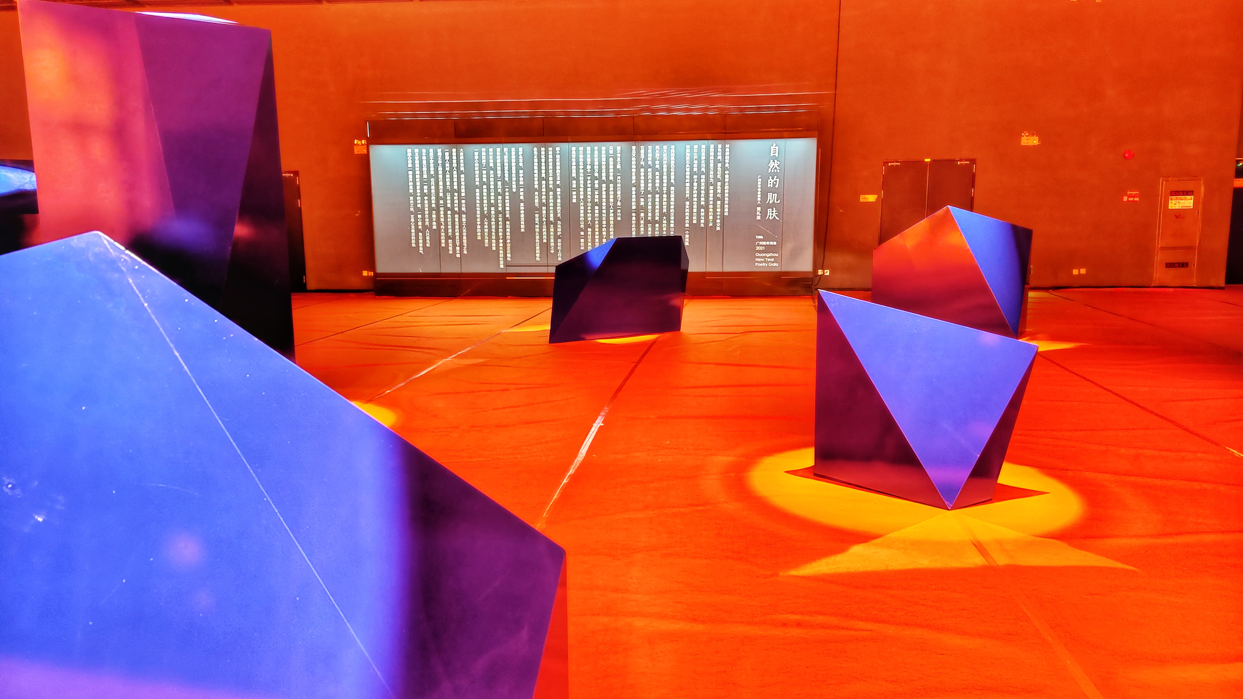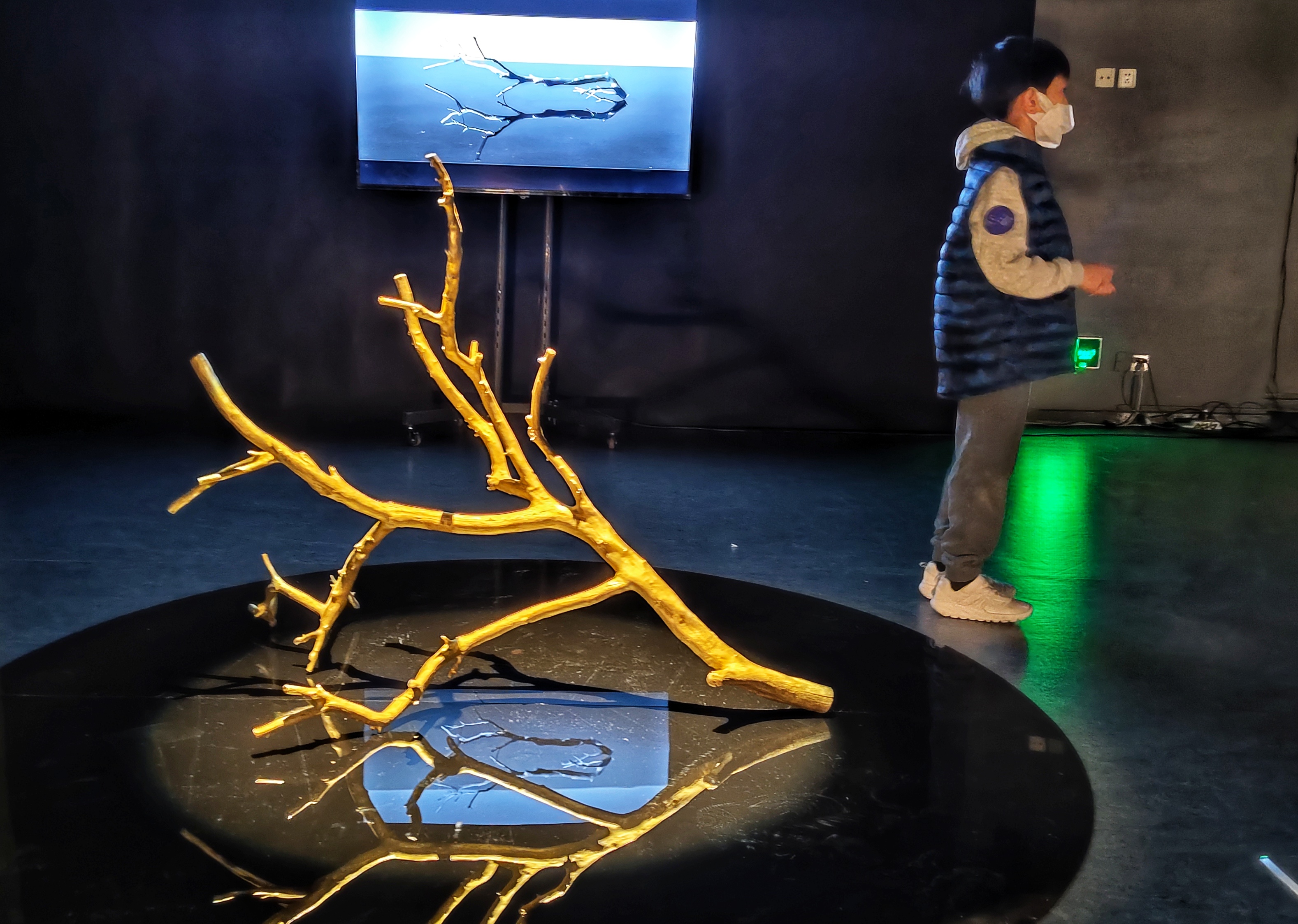从诗歌文本出发,展览现场的《自然而然》交互数字艺术装置作品提炼了波德莱尔《感应》中的“自然是一座神殿,那里有活的柱子/不时发出一些含糊不清的语音”;黄礼孩的《拐弯处》“隐秘让一朵花保持着它的纯真/生活没有什么可以炫耀/我保留了拐弯处被遗忘的花朵”等中外诗人的十二首诗,从诗性空间出发,柯咏恩和她的团队用数字艺术将其构建成一个虚拟的世界,用编程的语言解读万物,并在虚拟的世界中寻找自然性、公共性、真实性,计算机生成的粒子,时而如流沙,如星光,或是大海、楼宇,尝试将虚拟空间与现实中的自然互融成为一种新的自然境况。