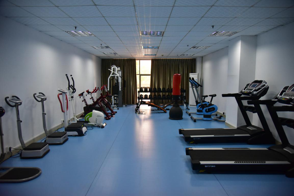 健身室内有跑步机、动感自行车、按摩机等器械。