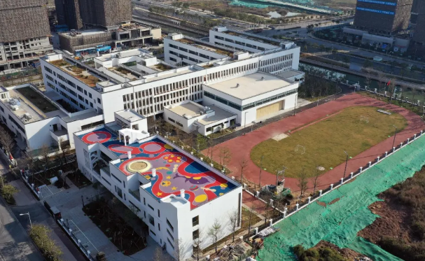 学校在室外跑道操场旁设置了一处风雨操场,以方便学生在风雨天气下也能进行室内体育活动。风雨操场内部为面积830平方米的室内篮球场,放置了两处伸缩看台椅,共112个座位;面向跑道操场一侧为长达18米、高5米的电动伸缩门,伸缩门拉开后室内、室外两个操场可合为一体。学校各功能区域更是按高标准建设。两栋教学楼共设置24个班级、首层设置自行车库、声乐室、舞蹈室,素质教学楼设置多媒体教室、语言教室、阅览室等,活动楼设置书画教室、书法活动室、美术教室等,食堂可容纳约400人就餐,地下一层停车场设置了60个车位。