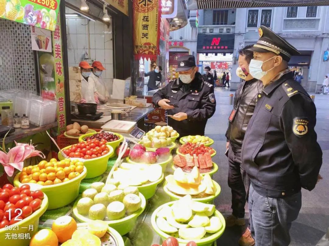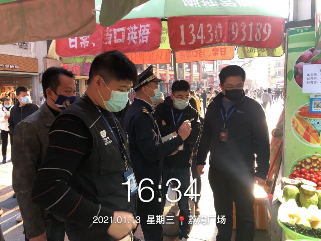 小e向上下九步行街管理服务中心负责人了解到,1月12日下午17点,步行街管理服务中心便已联合华林派出所、街城管执法队对街内10 家正在经营水果店的店铺,围绕其超占经营、涉嫌欺诈、短斤缺两和计量器摆放隐蔽等行为进行整治行动,并派发通知书10份。