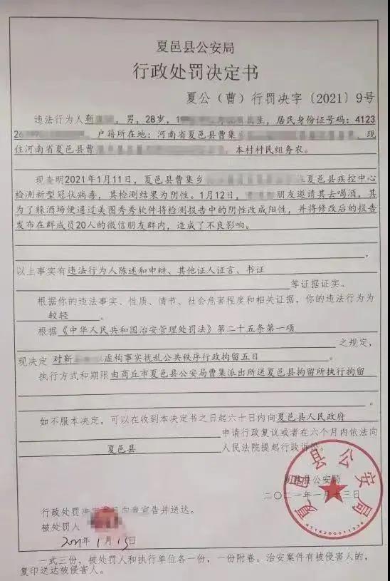 夏邑县公安局曹集乡派出所办案民警田猛介绍,事发在1月12日,靳某的朋友邀请他去喝酒,他为了“躲酒局”,把自己前一天核酸检测阴性的报告修改之后,发到有20个人的微信群里。核实后,公安机关对靳某处以行政拘留五天。