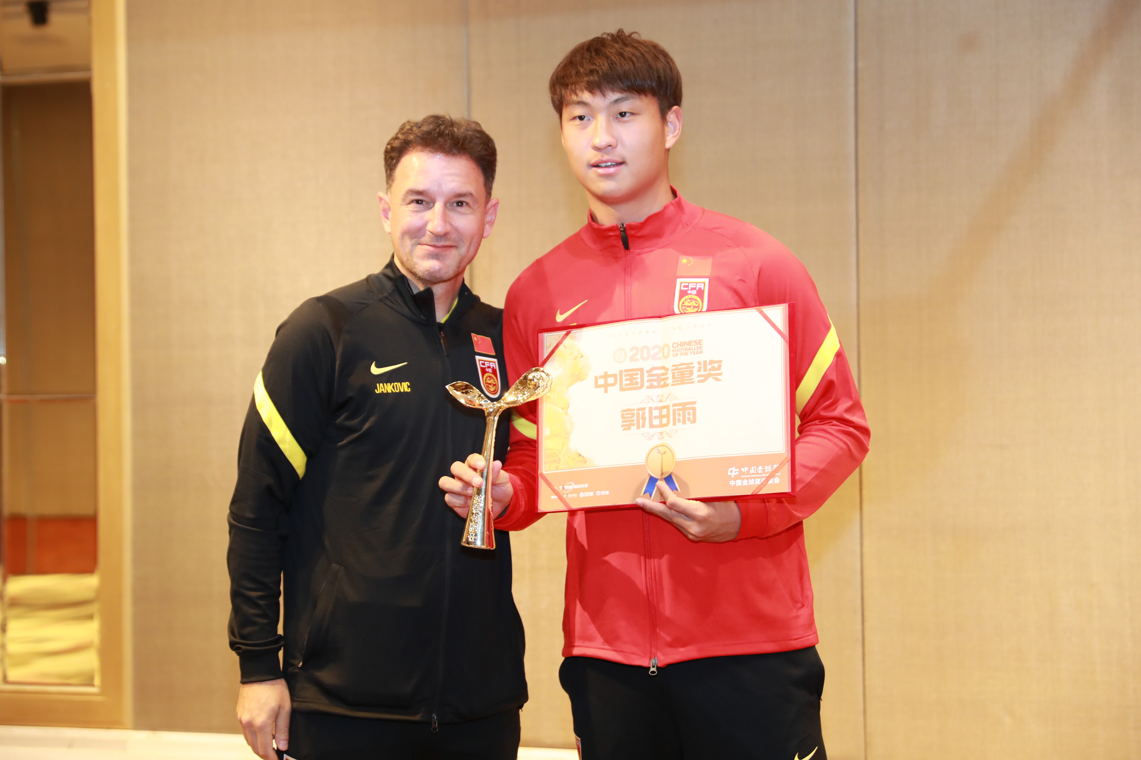 2020中国金童奖授予年度表现最佳的U21球员,他们也是杭州亚运会和U23亚洲杯的适龄球员。郭田雨、韩佳奇和温家宝等人在过去一年中的表现有目共睹,最终山东鲁能的高中锋郭田雨脱颖而出,获取中国金童奖的荣誉,他的得分是475分。广州富力门将韩佳奇和上海绿地申花边卫温家宝分别以339分和268分的成绩位列2020中国金童奖评选的第二和第三位。正在参加U22国足集训的三人在海口接受了中国金童奖的奖杯和证书。