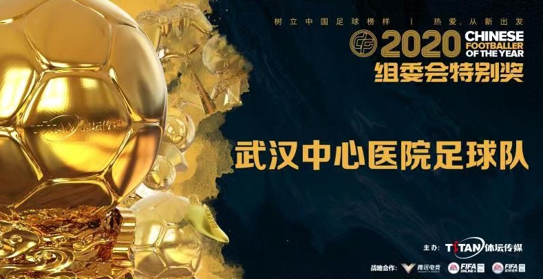 为了纪念2020这特殊的一年,中国金球奖组委会颁发了两个组委会特别奖,分别授予了武汉中心医院足球队和江苏赛区,向战斗在抗疫一线的热爱足球的医护人员以及为中国足球全面复赛做出卓越贡献的团队。