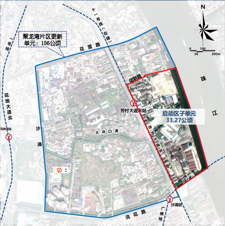 本次规划优先选取更新单元东部主体单一、权属清晰成片连片区域作为启动区。本次审议范围为启动区子单元范围,西至芳村大道东,北至信联路,东至珠江,南至沙涌,面积约33.27公顷。