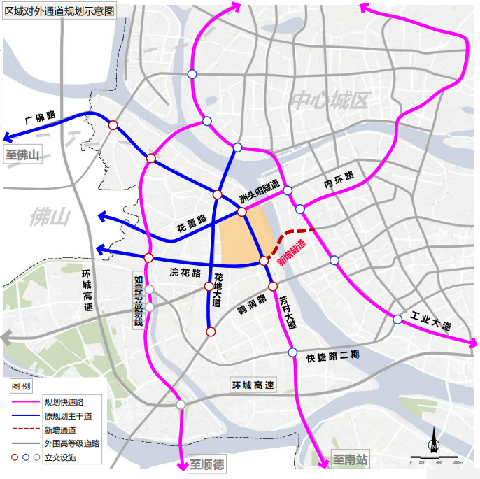 交通规划方面,本次规划的最大特色是针对过江通道交通容量不足的问题,增加1条过江隧道,改善白鹅潭地区过江交通瓶颈问题;此外打通了1.2公里的鹅潭路,沿后航道新增一条景观大道。