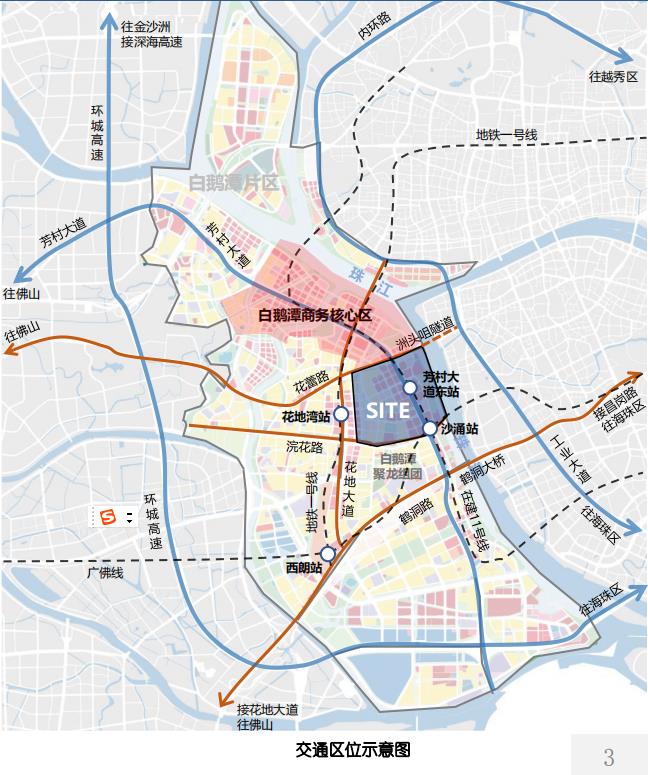 聚龙湾城市更新单元位于白鹅潭聚龙组团,毗邻白鹅潭商务核心区。单元地理区位条件优越,距广州市政府约5公里,距珠江新城和千灯湖均为10公里左右,是广佛同城战略的重要核心节点。单元交通条件优势明显,轨道11号线、广佛线设站于基地内部;可通过花蕾路、花地大道等快速接驳内环路、环城路联系城市周边地区。