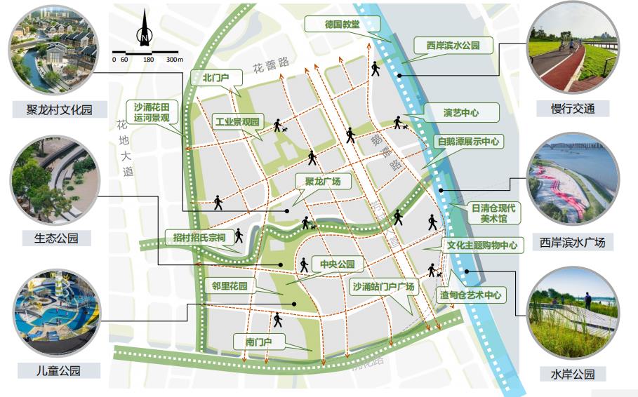 此外,结合滨水及公共空间,打造“一带三轴多放射”的慢行交通网络,总长度约22公里,构建连续、有趣味的慢行系统。一带:滨江慢行带,沿珠江岸线设置,长度约1.3公里;三轴:滨水绿轴慢行道,沿范围内河涌岸线设置,连接滨江景观带,长约4.2公里;多放射:慢行步道+自行车道,连接片区主要景观带,向四面八方分散设置,长约16.5公里。